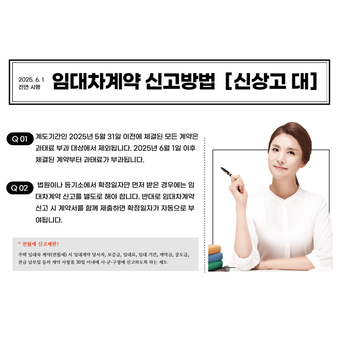 🚨 2025년 6월 1일부터 달라지는 임대차계약 신고 제도부동산거래관리시스템 바로가기주택 임대차계약을 체결하셨나요? 그렇다면 반드시 알아야 할 중요한 변화가 있습니다. 2025년 6월 1일부터 주택 임대차계약 신고 의무를 위반할 경우 과태료가 본격적으로 부과됩니다. 4년간의 계도기간이 2025년 5월 31일로 종료되면서, 이제 임대차계약 신고는 선택이 아닌 필수 의무가 되었습니다. 📋 주택 임대차계약 신고 대상은? 💰 금액 기준주택 임대차계약 신고 대상은 다음 중 하나라도 해당되면 신고해야 합니다. · 보증금 6천만 원 초과 · 월 차임 30만 원 초과 예를 들어, 보증금 5천만 원에 월세 35만 원인 계약이라면 월세가 30만 원을 초과하므로 신고 대상입니다.🗺️ 지역 기준신고 대상 지역은 ..