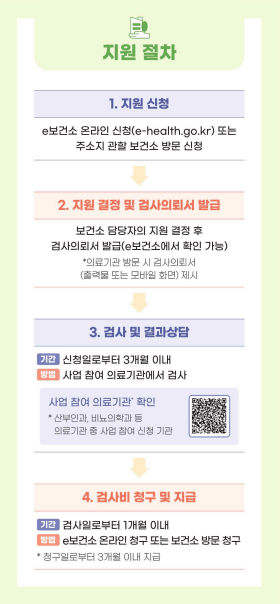 A: 전국 어디서나 신청 가능하며, 타 지역 의료기관에서도 검사를 받을 수 있습니다. 지원 제도의 전국 통용성이 큰 장점입니다.